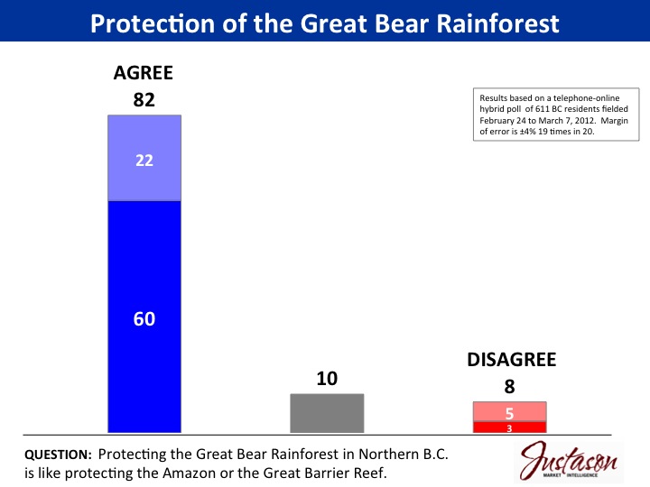 A strong majority of B.C. residents agrees that protecting the Great Bear Rainforest is like protecting the Amazon or the Great Barrier Reef. In total, 82% agree. Six in ten (60%) B.C. residents strongly agree .