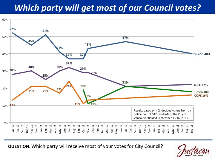 Vancouver B.C. (27 Sep 2013) – A September 2013 survey of Vancouver residents by Justason Market Intelligence finds support for governing Vision Vancouver has fallen to 40% from 47% just over a year ago. Non-partisan Association (NPA), Green, and COPE garner support from 22%, 18% and 16% of decided municipal voters.