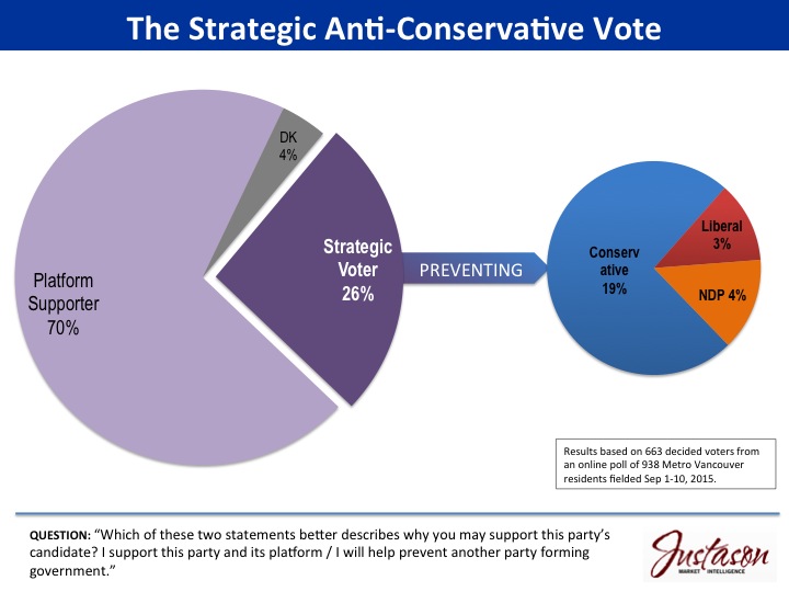 Vancouver B.C. (19 Sep 2015) – Strategic voting may play a role in Metro Vancouver voters’ decisions about a quarter of the time. While the majority (70 per cent) tell us they truly support their choice and its election platform, one-in-four decided voters (26 per cent) tell us their choice is strategic–they “will help prevent another party forming government.”
